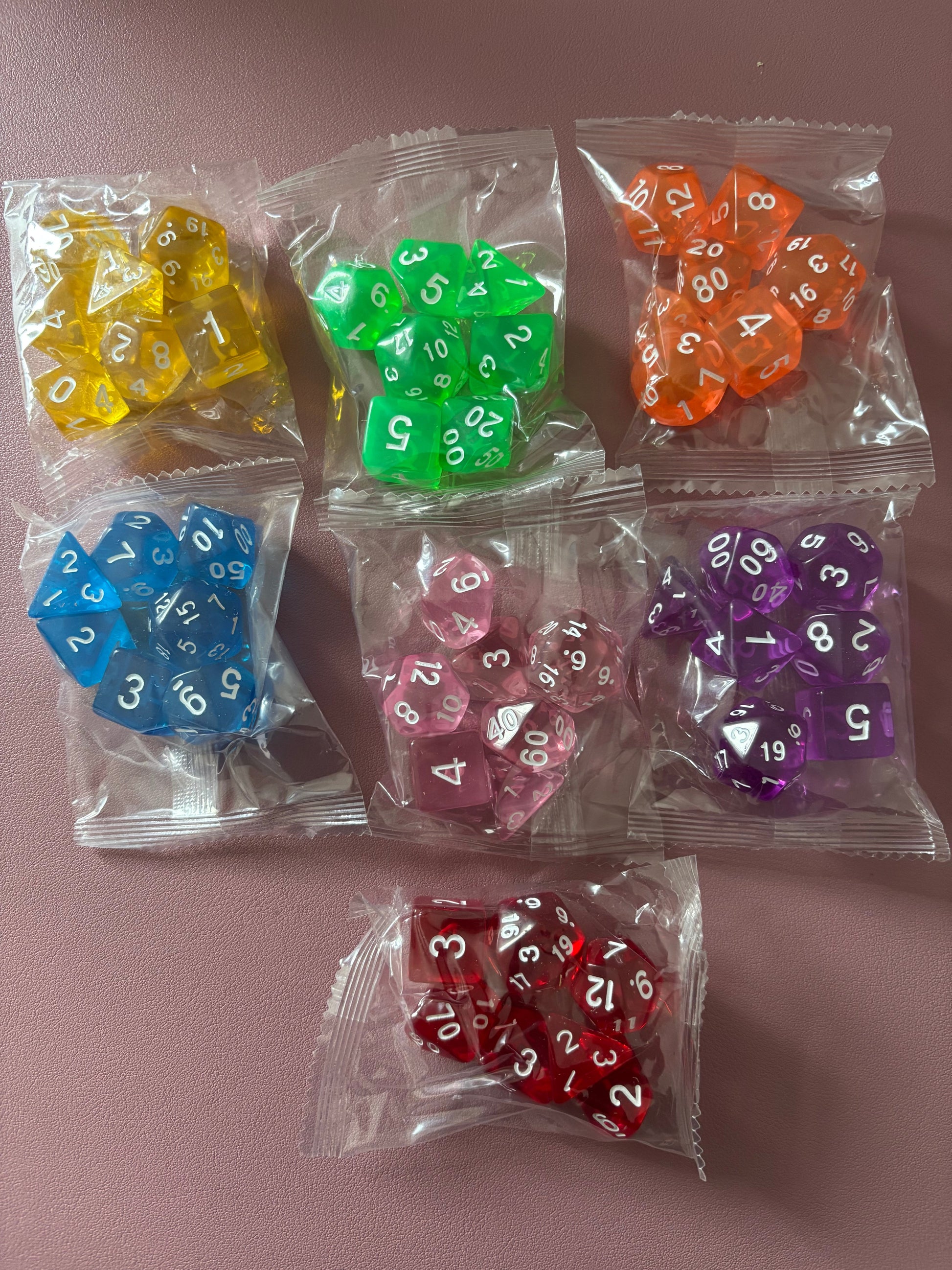 Würfelset mit 7 unterschiedlichen Würfeln.